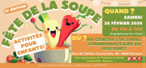 La Fête de la soupe du PAC Rocourt est un moment convivial et gourmand qui rassemble le tissu associatif du quartier. Chaque association y tient un stand et propose sa soupe maison, reflet de sa créativité et de sa culture.