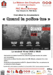 La régionale de PAC Mons Borinage et le groupe montois des sans papiers de Mons ont décidés de s’ associer pour projeter ce documentaire  « Quand la Police Tue » en présence de la réalisatrice Cécile Guypen et de Manu Scordia.