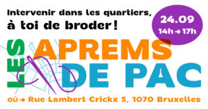 Présence et Action Culturelles vous propose une après-midi de broderie collective sur base d’une exploration du quartier du Triangle à Anderlecht (quartier où se trouvent les bureaux de PAC).