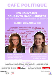 De quoi parlerons-nous à cette occasion? De la question de la résurgence des courants anti-féministes et qui prônent la domination des femmes par les hommes. Quelle idéologie se cache derrière ces courants nouveaux dit “masculinistes”? Est-ce un phénomène de mode, surtout axé sur les jeunes hommes, ou une vraie menace qui pèse sur les droits des femmes dans nos sociétés occidentales?