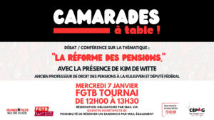 Dans le cadre de notre cycle d’échanges « Camarades, à table ! », le PAC WAPI avec la FGTB Wapi, les Jeunes FGTB et le Cepag vous invite à une nouvelle rencontre consacrée à un enjeu central pour le monde du travail : la réforme des pensions.