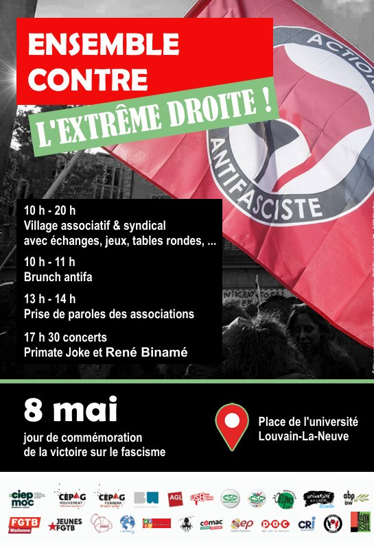 Dans le cadre de la Coalition du 8 mai et de la mobilisation contre la montée de l’extrême droite, PAC Brabançonne et ses partenaires vous invitent à participer à une grande journée d’actions et de rencontres à Louvain la Neuve, le 8 mai.