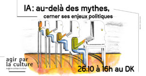 Pour prolonger la réflexion initiée dans le N°73 d’Agir par la culture « Sortir du vertige artificiel », le Mouvement Présence et Action Culturelles et Tactic asbl ont le plaisir de vous proposer une rencontre-débat autour des enjeux politiques et sociaux des IA avec Juan Sebastian Carbonell et Peggy Pierrot, suivie d’une projection du documentaire « En attendant les robots», en présence de Pierre Adamczyk et Tabatha Duval.