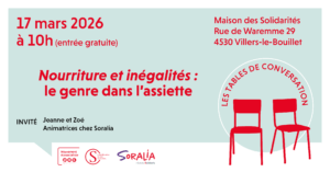 À l’initiative de Séniors Actifs de la fédération du PS de Huy-Waremme, en partenariat avec la régionale PAC de Huy-Waremme et Soralia, des « Tables de conversation » sont organisées au moins une fois par mois à la Maison des Solidarités de Villers-le-Bouillet. Le principe : rassembler un groupe de personnes pour échanger et réfléchir librement sur des thématiques de société en lien avec l’arrondissement de Huy-Waremme, en faisant appel à des personnes ressources. La présentation est suivie d’échanges encadrés