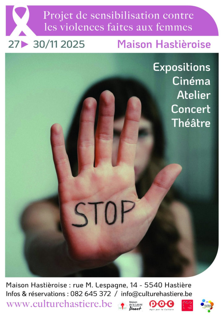 A l’occasion de la Journée internationale contre les violences faites aux femmes, le Centre Culturel en partenariat avec le PCS, la Maison de la Laïcité de l’arrondissement de Dinant et Présence et Action Culturelles Dinant-Philippeville lancent un projet de sensibilisation contre les violences faites aux femmes. A travers diverses activités, ce projet a l’ambition d’aborder les dif férents types de violences, qu’elles soient physiques, morales, institutionnelles, banalisées, sous des formes et des tons variés.