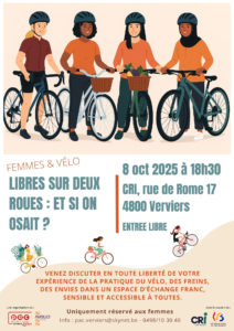 Cette table ronde, née de la rencontre avec deux verviétoises passionnées de vélo, a pour objectif de permettre une première rencontre entre femmes qui pratiquent ou non le vélo, afin d’exprimer en toute liberté leur expérience, évoquer les difficultés rencontrées, ou encore leurs envies. Tout cela dans un espace d’échange franc, bienveillant, et accessible à TOUTES.