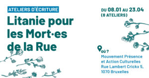 Une cérémonie annuelle se tient également à l’Hôtel de Ville de Bruxelles durant laquelle la mémoire de chaque défunt·e est célébrée par la lecture d’une litanie de poèmes que nous vous invitons à co-écrire lors de ces huit sessions d’ateliers que nous vous proposons. Ensemble, nous tisserons un récit collectif pour se souvenir de chacune de ces personnes.