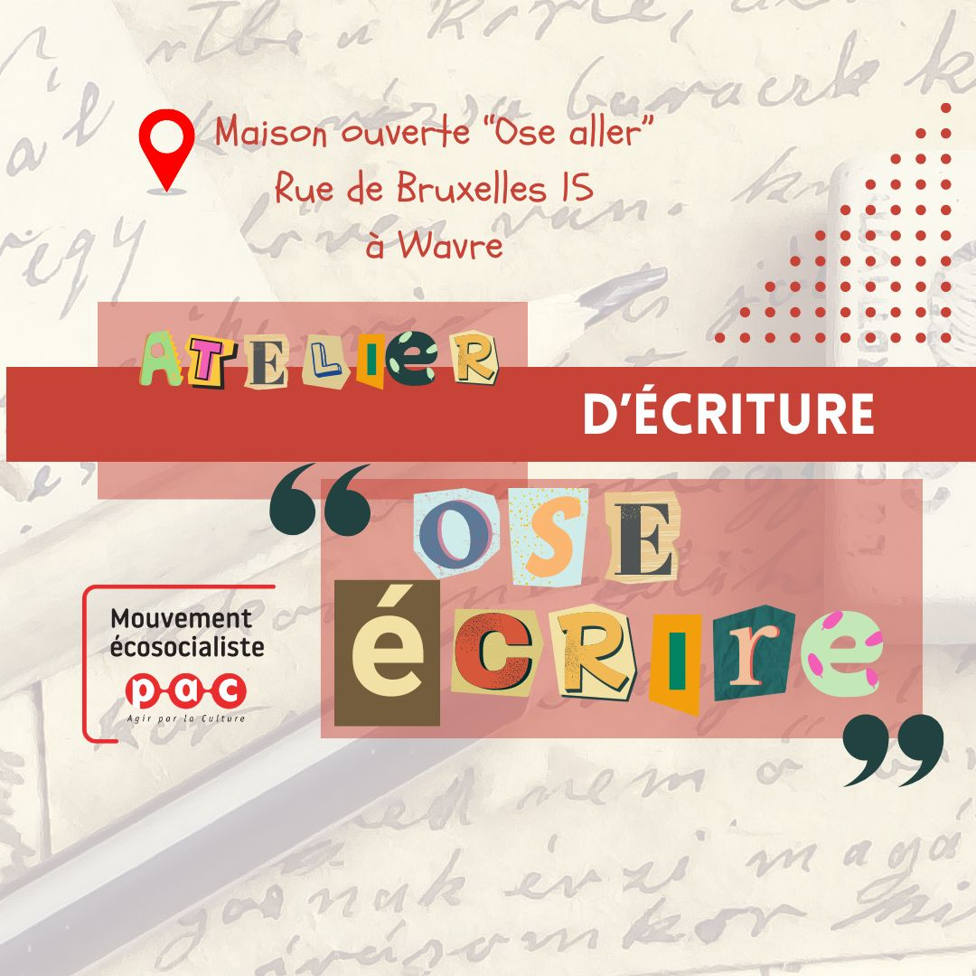 Chaque quatrième jeudi du mois, de 14h à 16h, PAC Bw a le plaisir de bénéficier de l’accueil de la Maison Ouverte “Ose Aller” à Wavre, pour y organiser un atelier d’écriture : Ose écrire !
